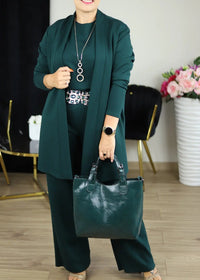 Elegantiškas ilgas megztinis, palaidinė ir kelnės, trijų dalių komplektas